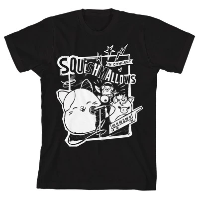 Rock out with your favorite Squishmallows tee. The shirt features black and white images of your favorite Squishmallows rocking out on the drums, mic, and keyboard while white and black letters read, “Squishmallows in Concert.” The tee comes in a black short sleeve crew neck. Squishmallows fans will love this comfy cotton tee.
